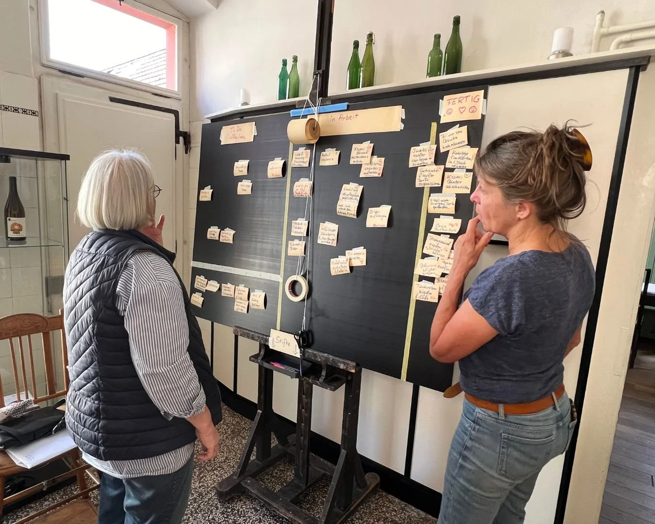 Margareta Pertl und Sabine Uhde an der ToDo-Tafel; Photo Credit: Sylvia Peter